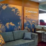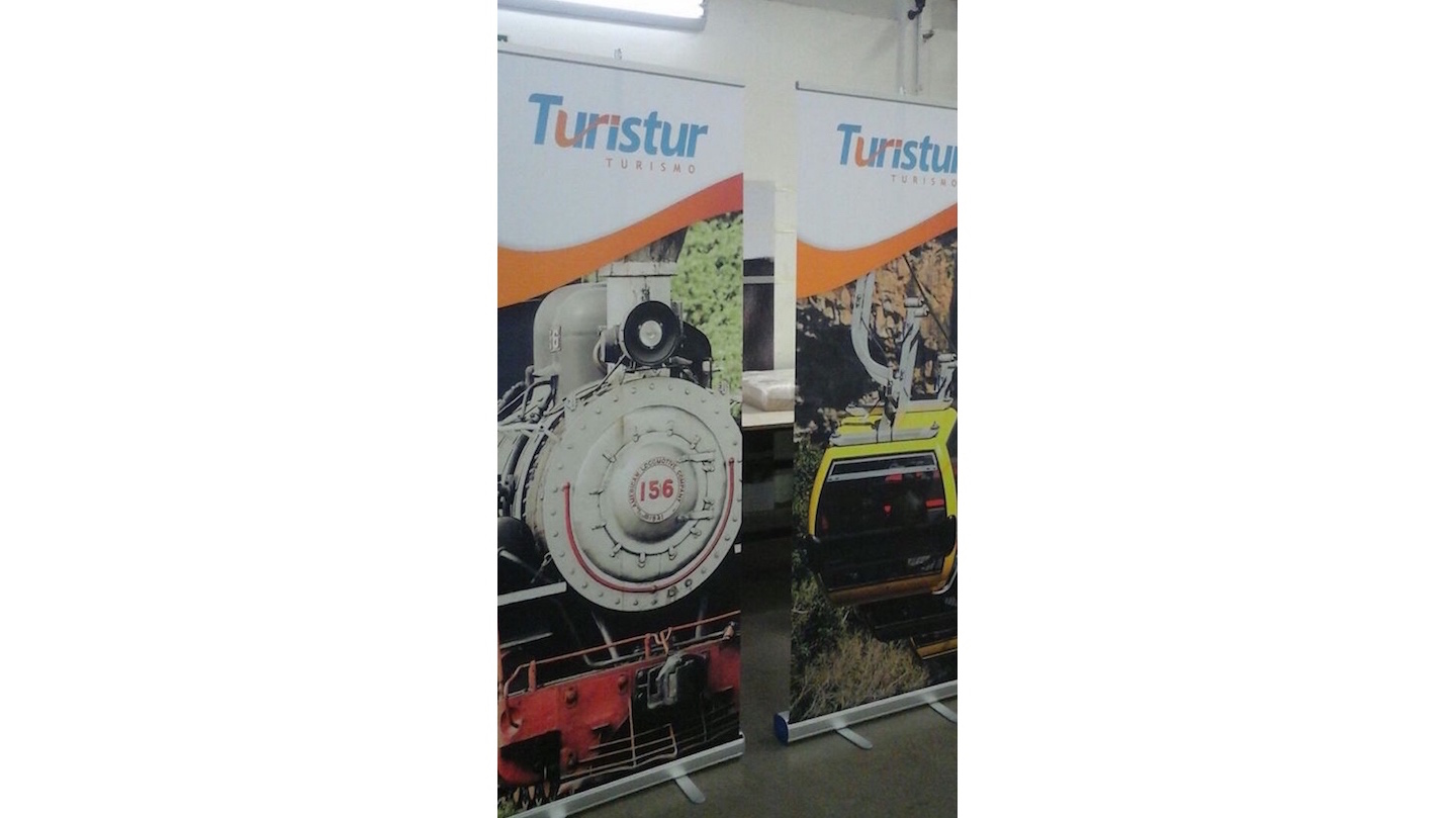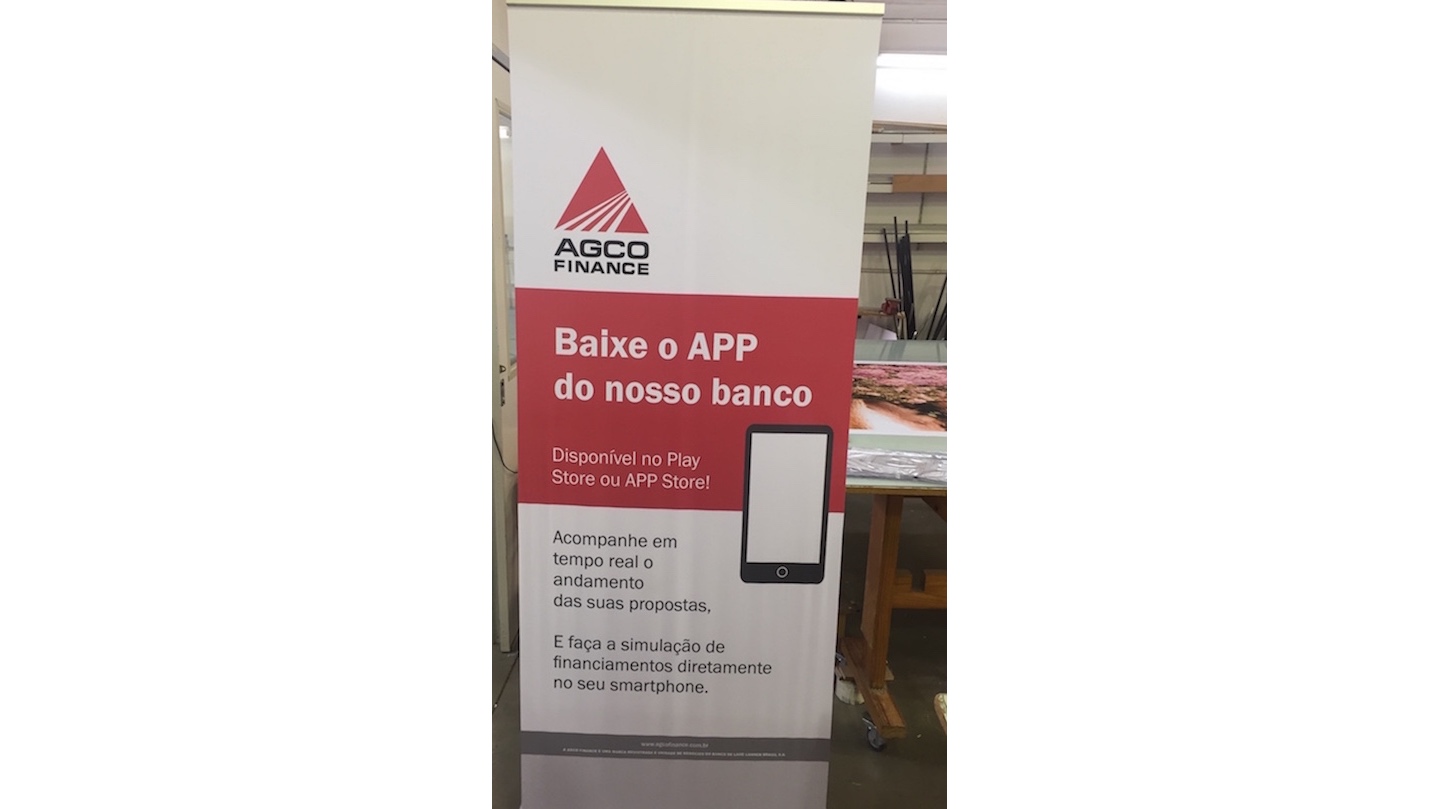 - Banner em tecido impresso por sublimação em estrutura Roll Up