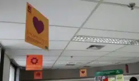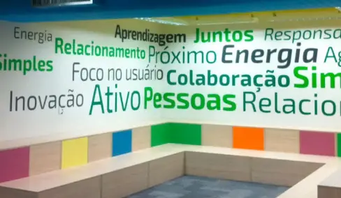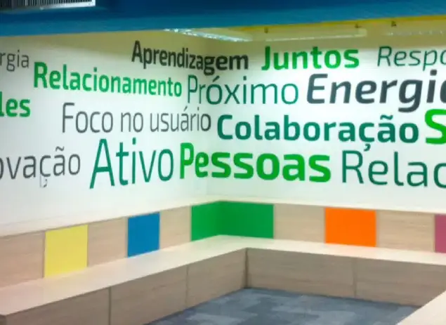 A comunicação interna é o elo para a equipe atingir os seus objetivos. Móbiles em PS com impressão UV e adesivagem de paredes.