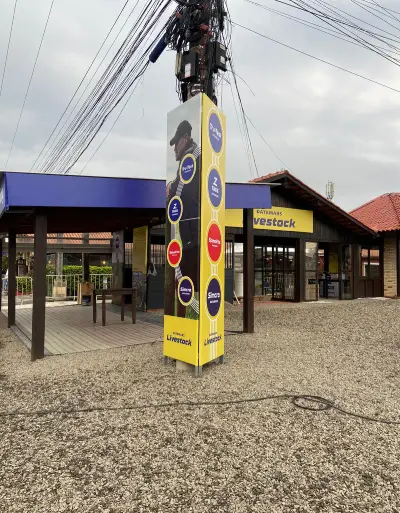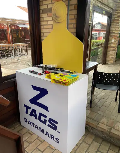 Estande promocional da Datamars na Expointer 2023, com sinalização vibrante, destacando suas marcas e produtos voltados para identificação e manejo de rebanhos. A composição inclui painéis, totens e materiais expositivos que reforçam a presença da marca.
