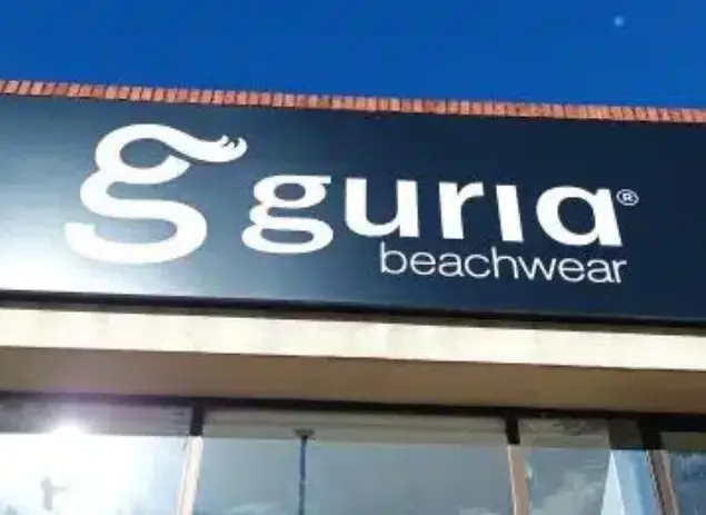 A fachada da Guria Beachwear apresenta design moderno e minimalista, com logotipo em destaque sobre um fundo preto, transmitindo elegância e identidade visual clara.