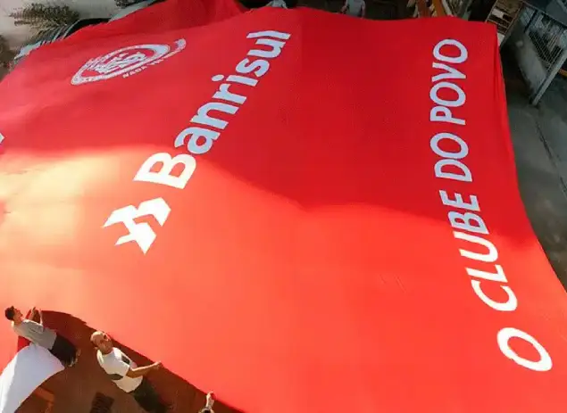 Bandeira em tecido oxfordine com tamanho de mais de 150 m quadrados. Confeccionada para exibição em jogo de futebol.