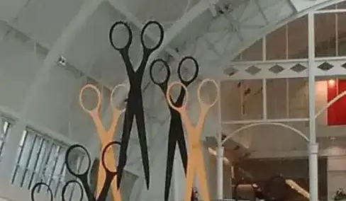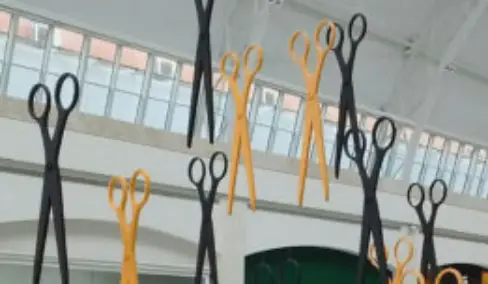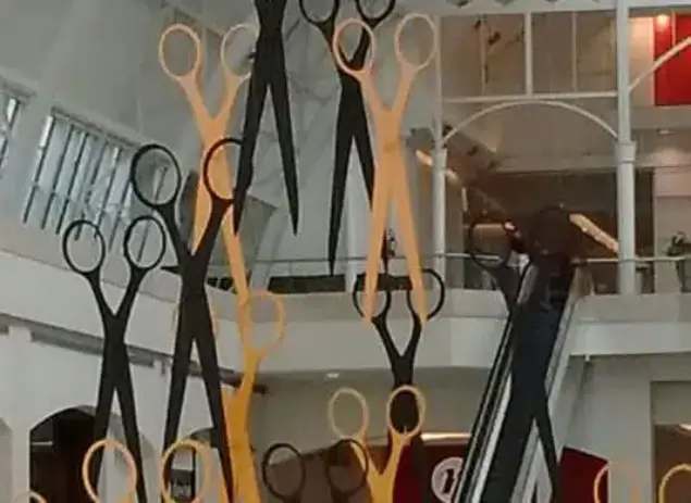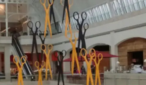 A tradicional liquidação do shopping Iguatemi se chama corta corta, simbolizada por uma tesoura aberta. Fomos desafiados a fazer estas tesouras voar em segurança na área do shopping. E o resultado foi este. Com material especial de última geração, elas eram muito leves e atingiram exatamente o objetivo desejado.