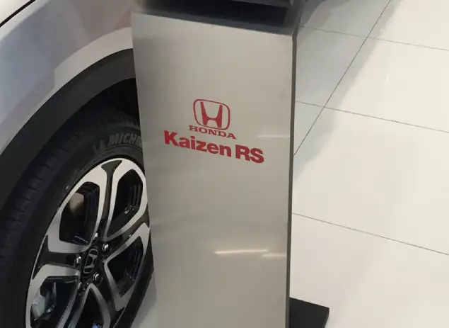 Totem em mdf, aço escovado e porta cartaz em acrílico cristal. Fica nas concessionárias Honda com a descrição do veículo em exposição.